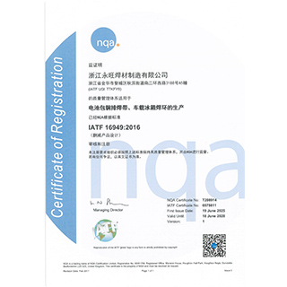 浙江永旺焊材制造有限公司是国内专业生产钎料的企业之一。致力于坚持围绕客户需求,为钎焊问题提供解决方案。 公司主要产品为“永旺”牌系列钎料,系列产品有:磷铜钎料、银磷铜钎料、银铜锌钎料、银锡焊料、及配套钎剂。钎料主要规格有:焊条、焊丝、焊环(异形环)、薄带、扁丝等。产品严格参照国家标准生产,并提供符合AWS、DIN、JIS或其他标准要求的各类钎料,同时根据客户需求提供的相应钎料产品和异型规格。